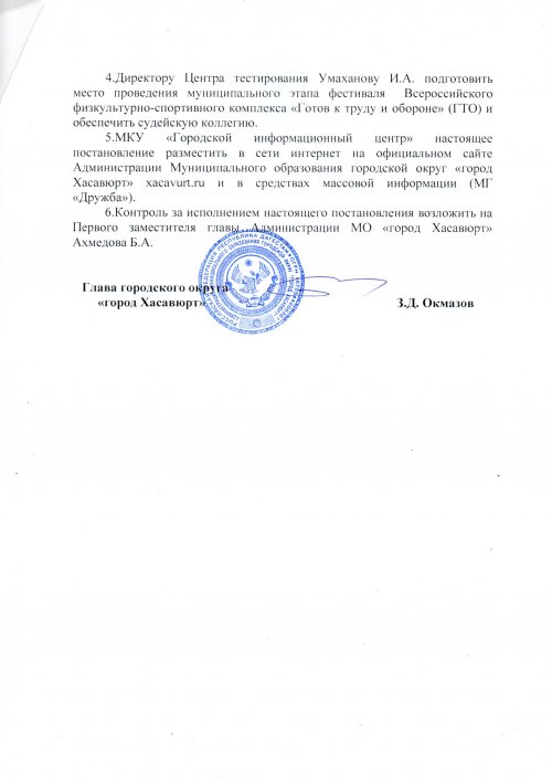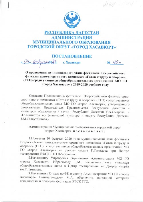 Постановление №46п от 04 февраля О проведении муниципального этапа фестиваля Всероссийского физкультурно-спортивного комплекса "Готов к труду и обороне" (ГТО) среди учащихся общеобразовательных организаций МО ГО "город Хасавюрт" в 2019-2020 учебному году