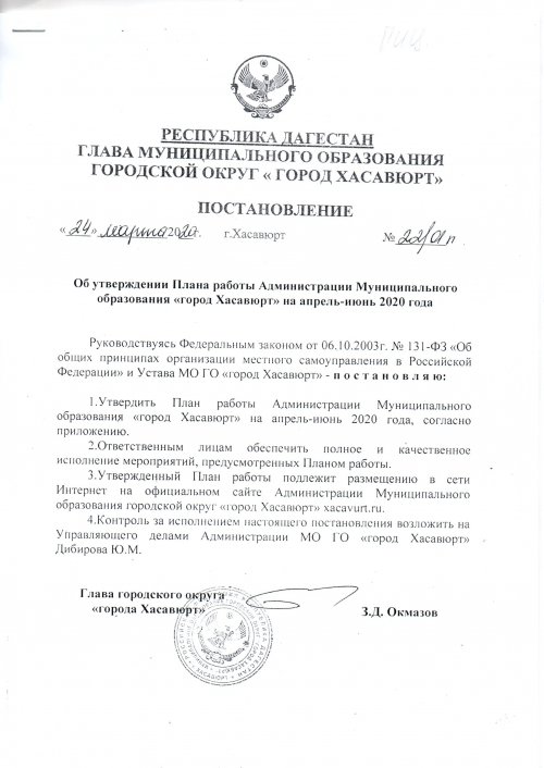 Постановление №22/01п от 24 марта об утверждении плана работы Администрации МО ГО "город Хасавюрт" на апрель-июнь 2020 г.