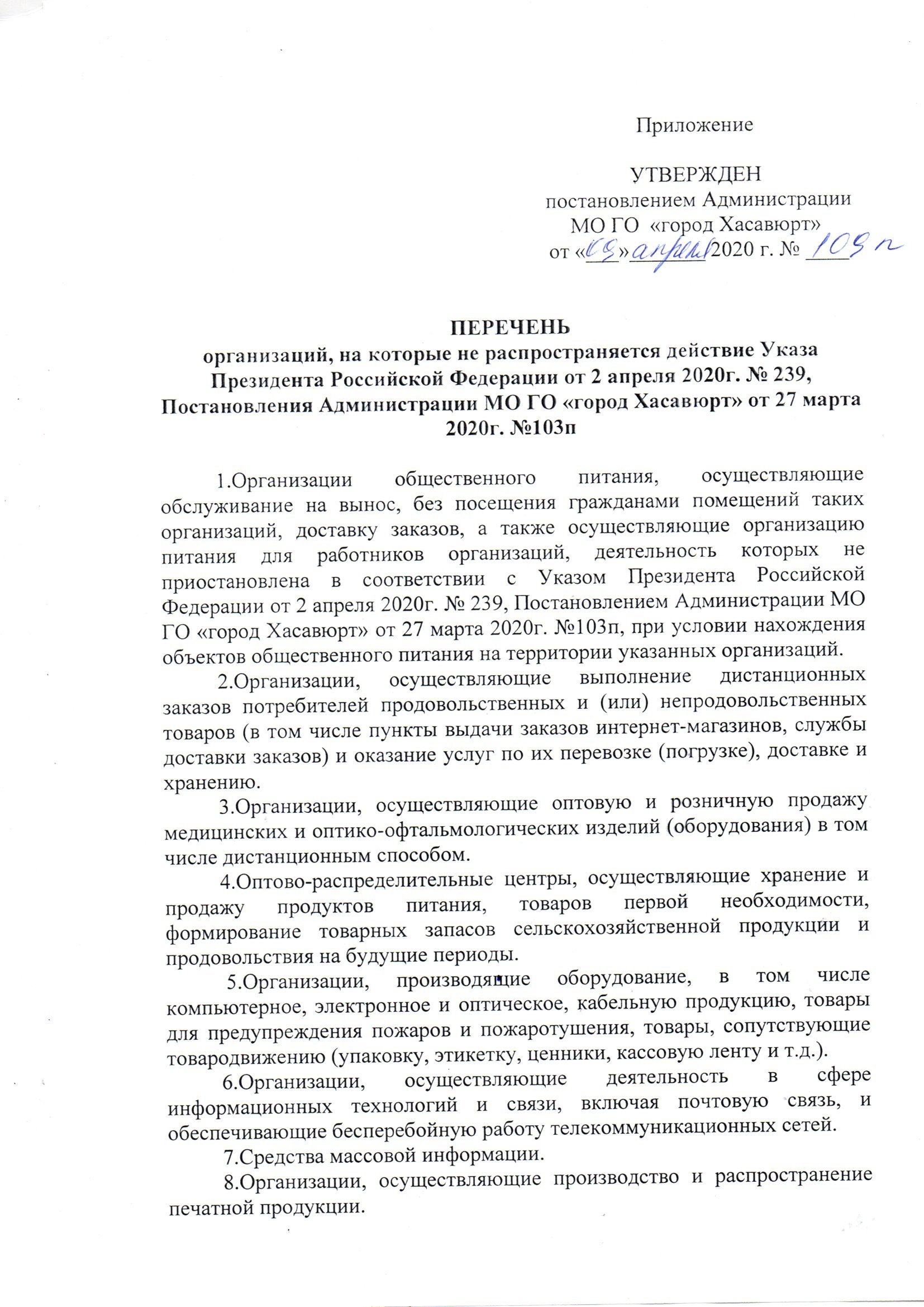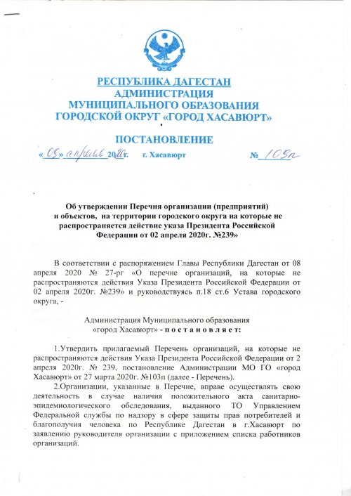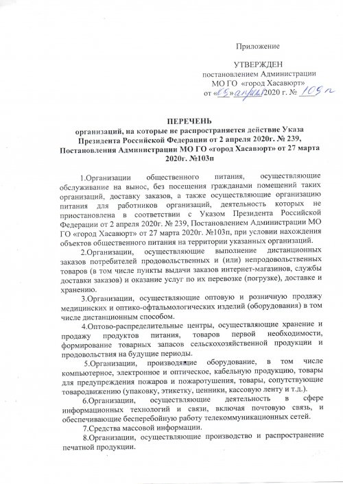 Постановление №109п от 09 апреля 2020 г. Об утверждении Перечня организации (предприятий) и объектов, на территории городского округа на которые не распространяется действие Указа Президента РФ от 02 апреля 2020 г. №239