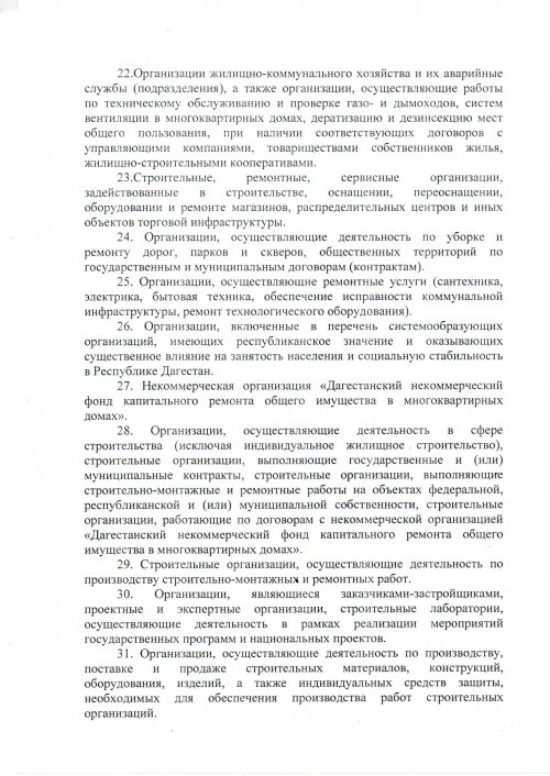 28. Организации, осуществляющие деятельность в сфере строительства (исключая индивидуальное жилищное строительство), строительные организации, выполняющие государственные и (или) муниципальные контракты, строительные организации, выполняющие строительно-монтажные и ремонтные работы на объектах федеральной, республиканской и (или) муниципальной собственности, строительные организации, работающие по договорам с некоммерческой организацией «Дагестанский некоммерческий фонд капитального ремонта общего имущества в многоквартирных домах».