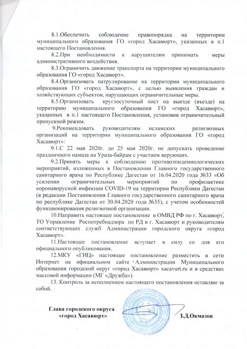 Постановление №129п от 21 мая 2020 г. О введении на территории городского округа "город Хасавюрт" режима ограничительных мероприятий