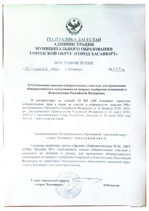 Постановление №134п от 10 июня 2020г. О публикации списков избирательных участков для проведения общероссийского голосования по вопросу одобрения изменений в Конституцию Российской Федерации