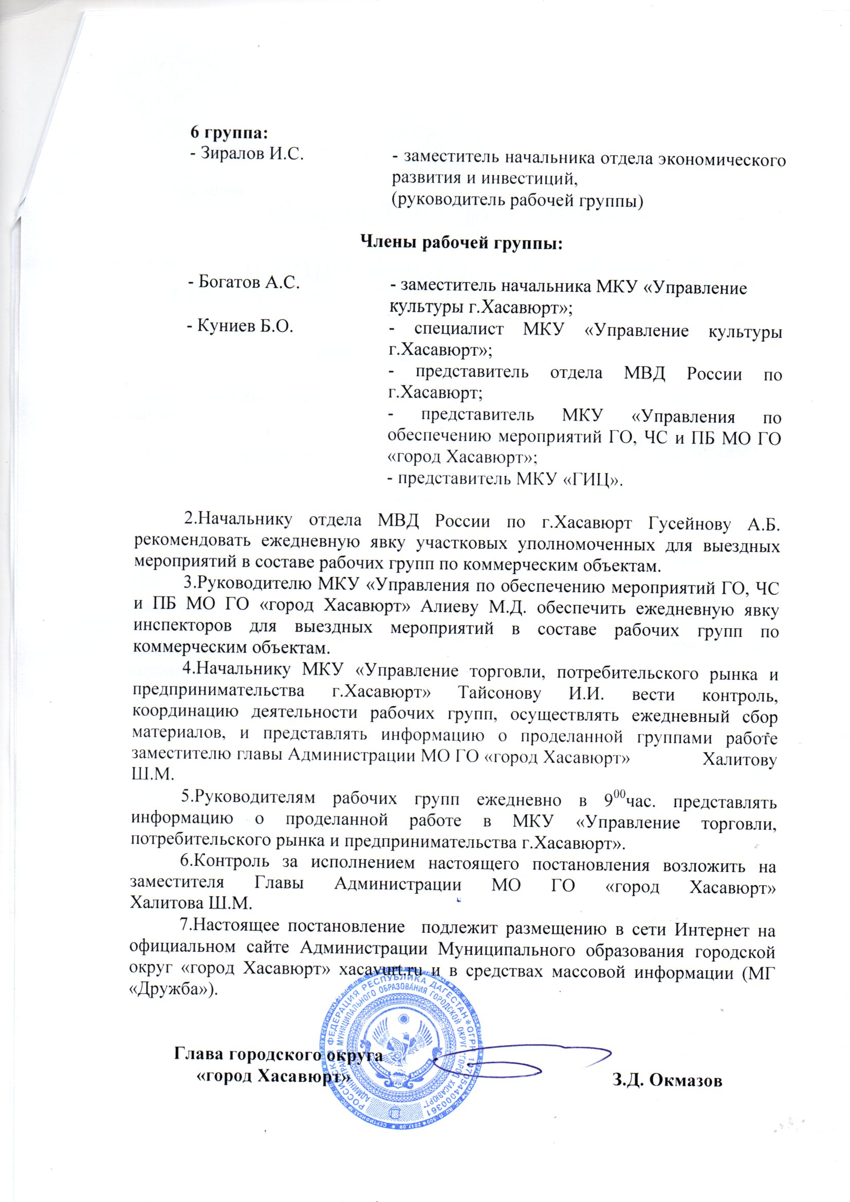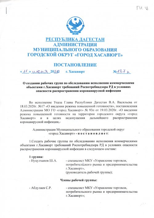 Постановление №137п от 11 июня 2020 г. О создании рабочих групп по обследованию исполнения коммерческими объектами г. Хасавюрт требований Роспотребнадзора РД в условиях опасности распространения коронавирусной инфекции