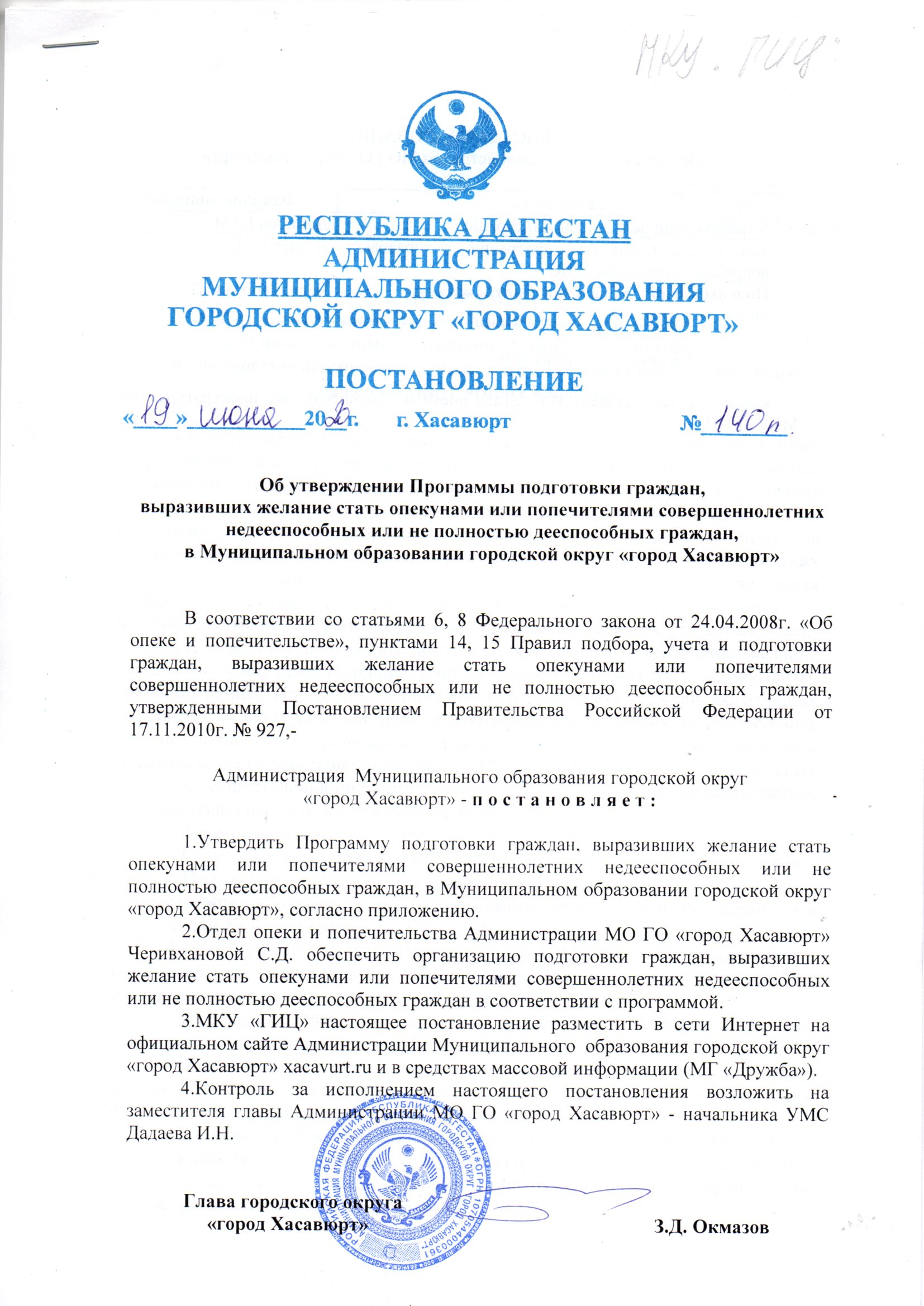 Постановление №140п Об утверждении Программы подготовки граждан, выразивших желание стать опекунами или попечителями совершеннолетних недееспособных или не полностью дееспособных граждан, в муниципальном образовании городской округ "город Хасавюрт"