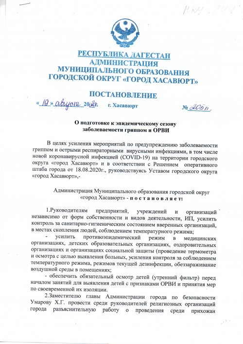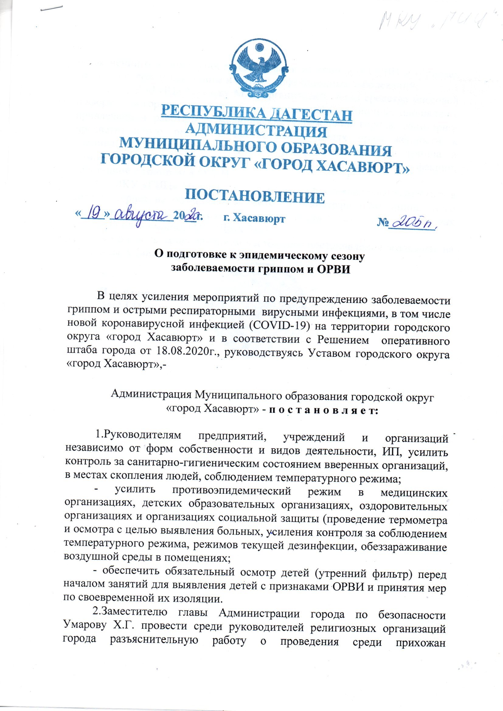 Постановление №205п от 19 августа 2020 г. О подготовке к эпидемическому сезону заболеваемости гриппом и ОРВИ