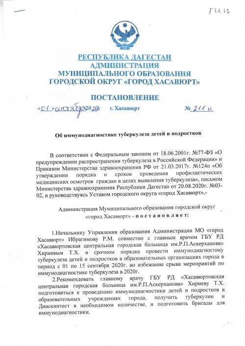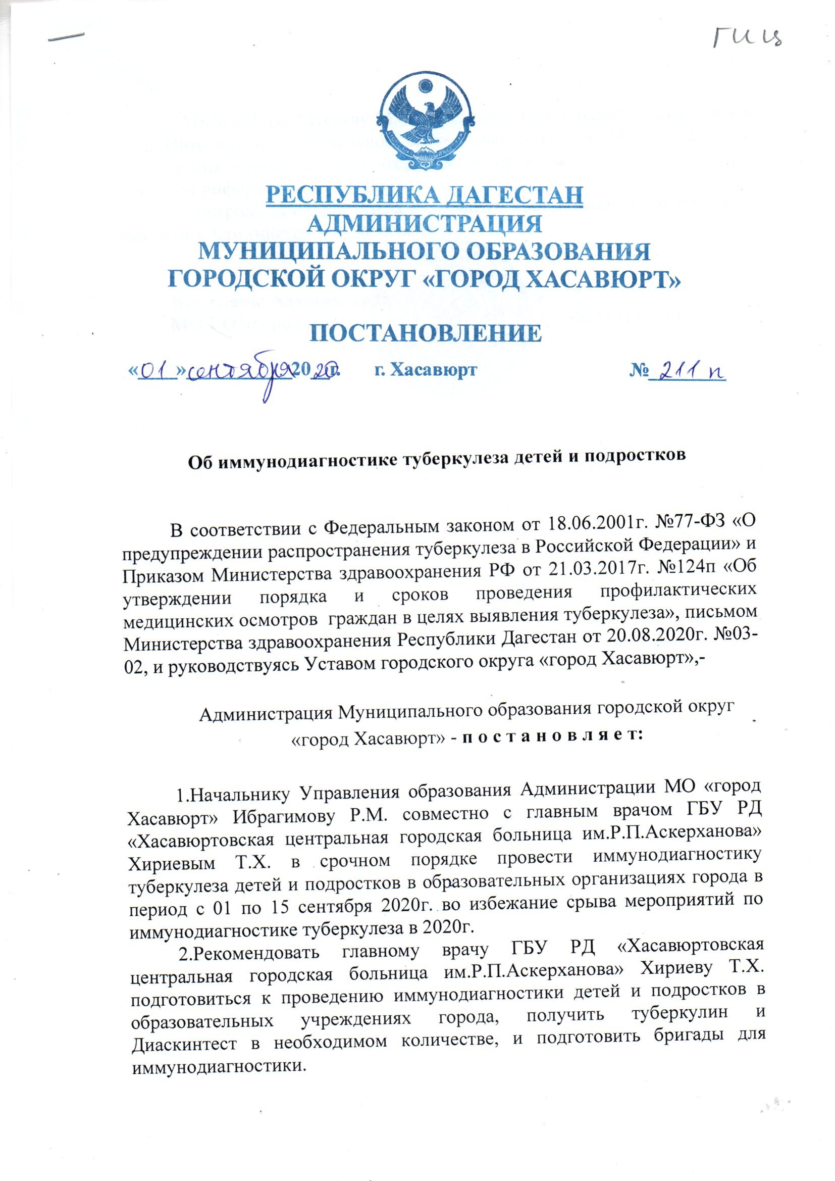 Постановление №211п от 01 сентября 2020 г. Об иммунодиагностике туберкулеза детей и подростков