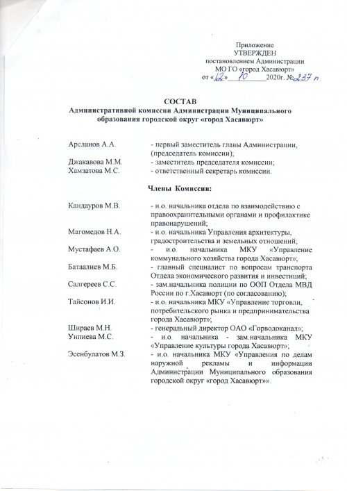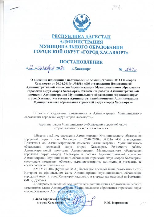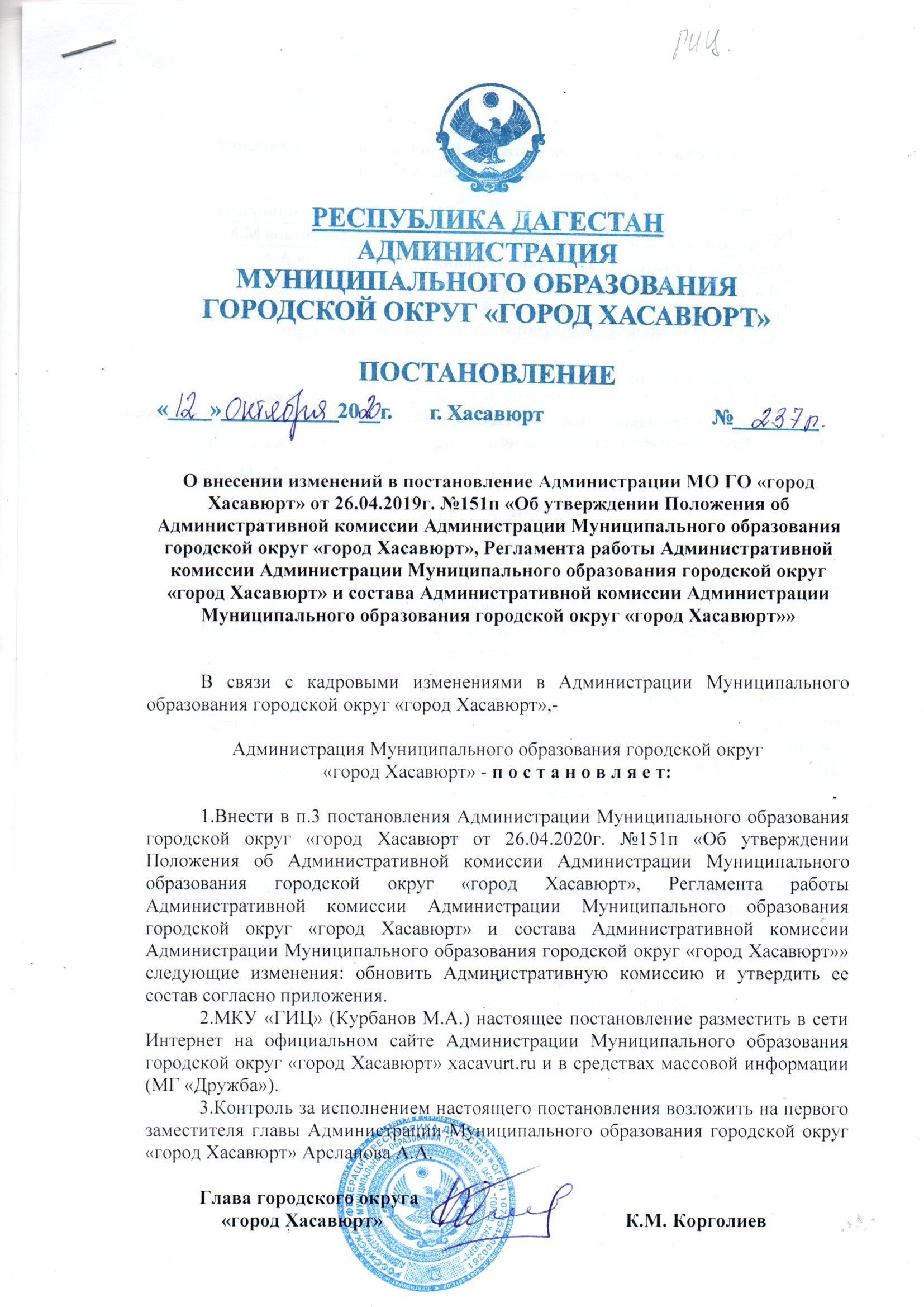 Постановление №237п от 12 октября 2020 г. О внесении изменений в постановление Администрации МО ГО "город Хасавюрт" от 26.04.2019 г. №151п "Об утверждении Положения об Административной комиссии Администрации МО ГО "город Хасавюрт", Регламента работы Административной комиссии Администрации МО ГО "город Хасавюрт" и состава Административной комиссии Администрации МО ГО "город Хасавюрт"