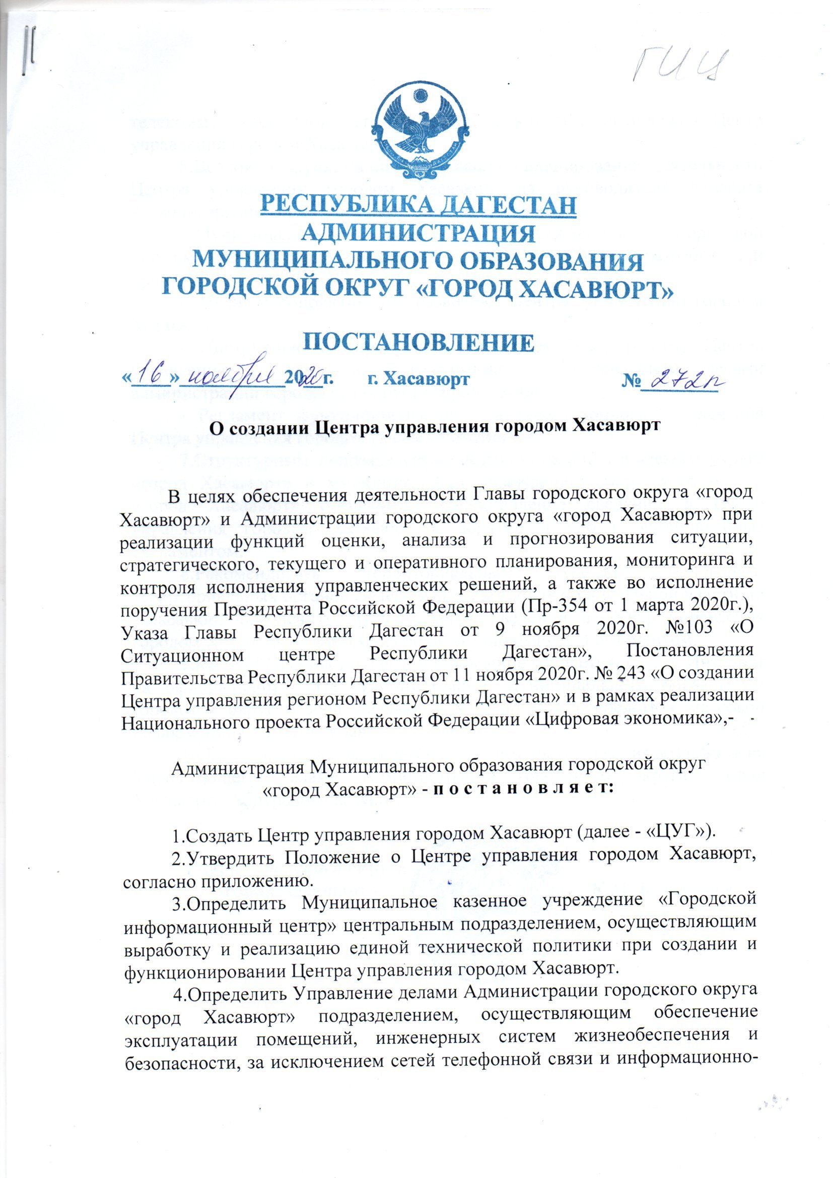 Постановление №272п от 16 ноября 2020 г. О создании Центра управления городом Хасавюрт