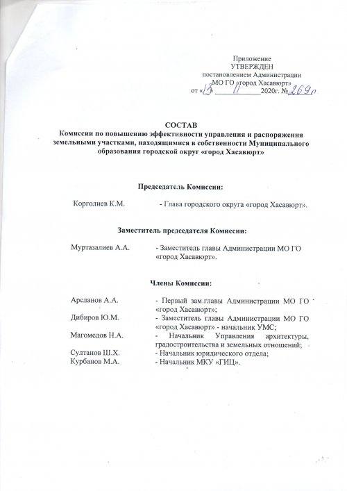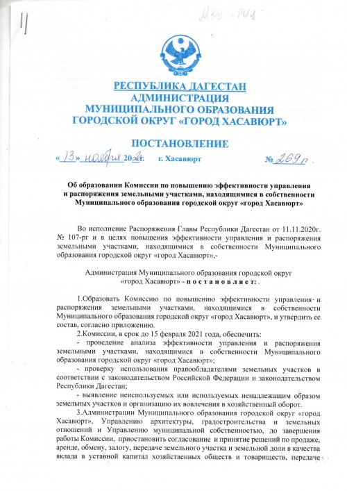Постановление №269п от 13 ноября 2020 г. Об образовании Комиссии по повышению эффективности управления и распоряжения земельными участками, находящимися в собственности Муниципального образования городской округ "город Хасавюрт"