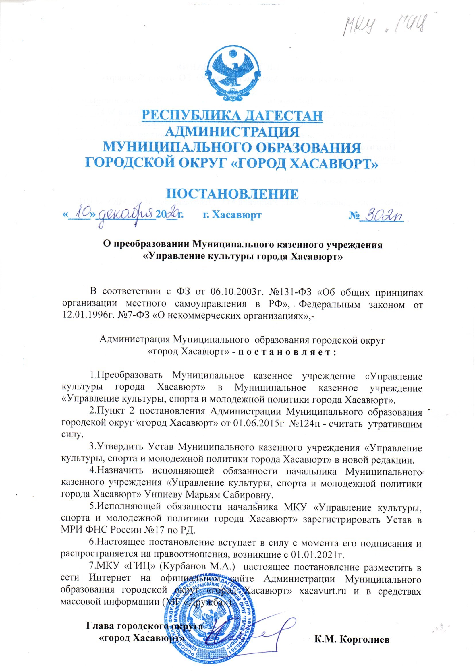 Постановление №302п от 10 декабря 2020 г. О преобразовании Муниципального казенного учреждения "Управление культуры города Хасавюрт"