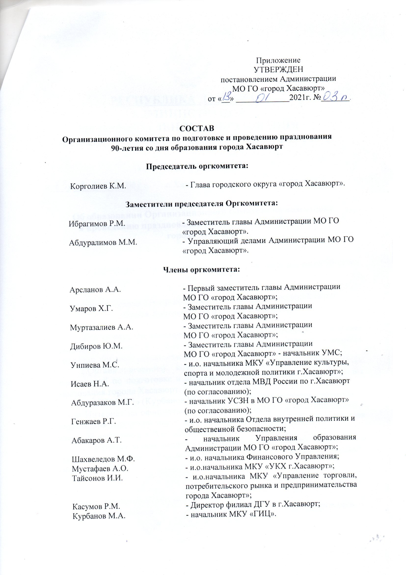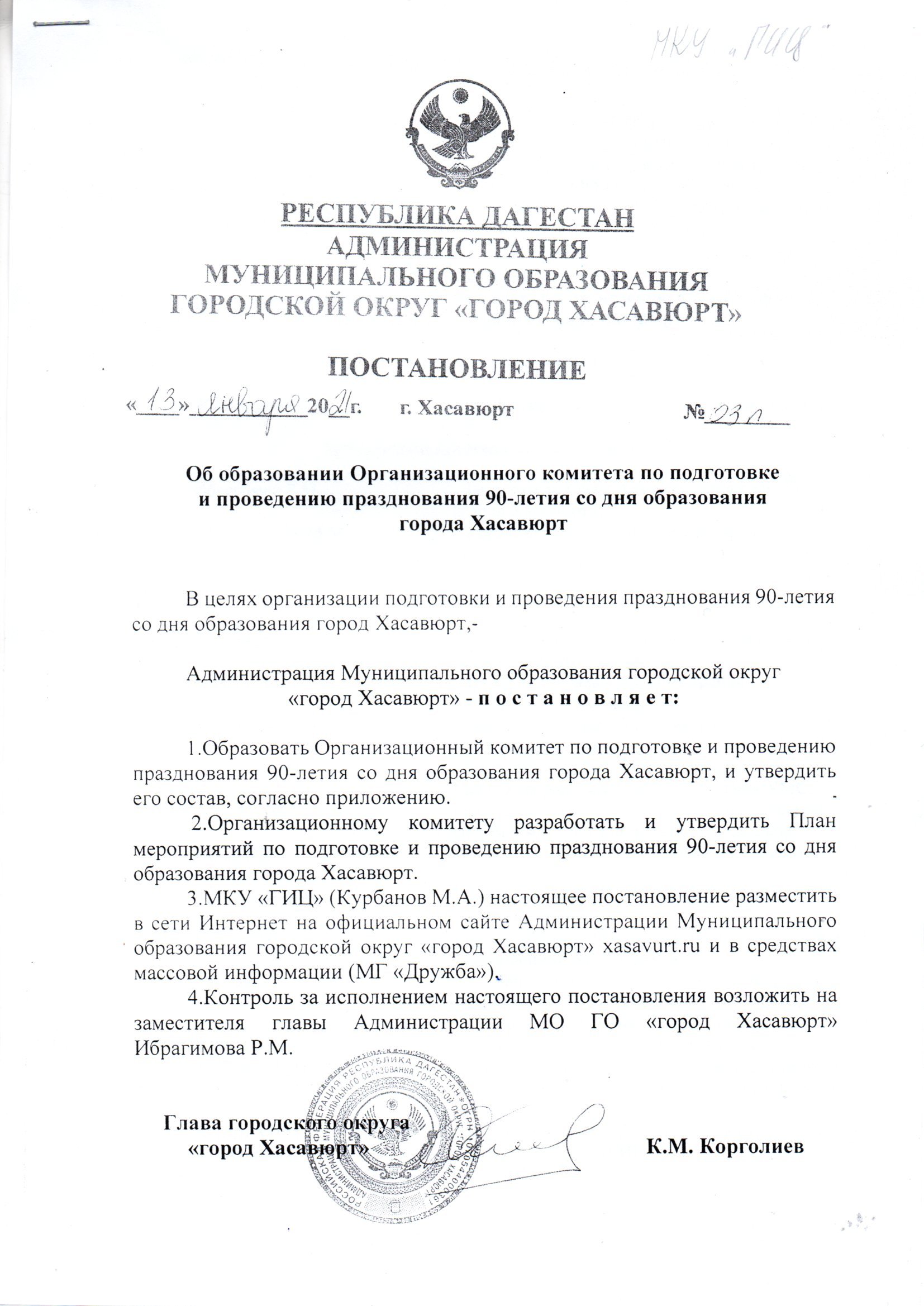 Постановление №23п от 13 января 2021 года Об образовании Организационного комитета по подготовке и проведению празднования 90-летия со дня образования города Хасавюрт