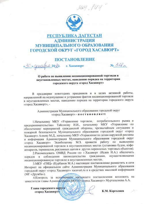Постановление №328п от 30 декабря 2020 г. О работе по выявлению несанкционированной торговли в неустановленных местах, наведению порядка на территории городского округа "город Хасавюрт"