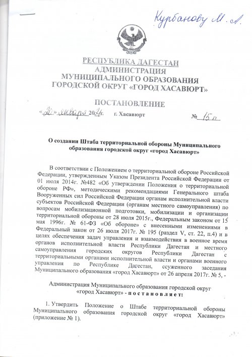 Постановление №15п от 20 января 2021 г. О создании Штаба территориальной обороны Муниципального образования городской округ "город Хасавюрт"