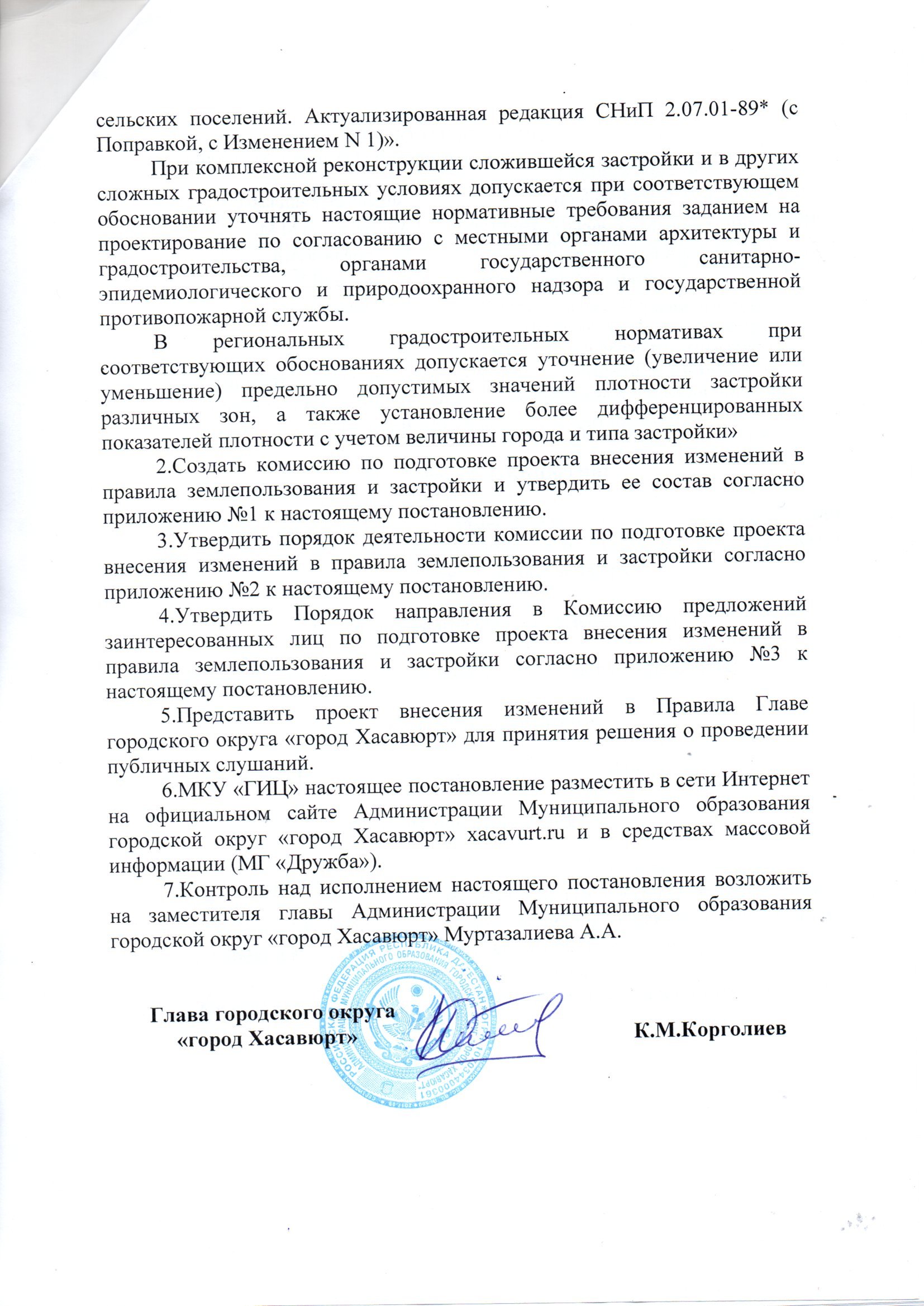 Постановление о внесении изменений в Генеральный план и Правила землепользования и застройки Муниципального образования городской округ "город Хасавюрт"