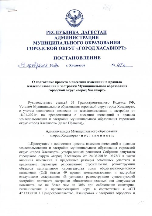 Постановление №48п от 03.02.21г о подготовке проекта о внесении изменений в правила землепользования и застройки Муниципального образования городской округ "город Хасавюрт"