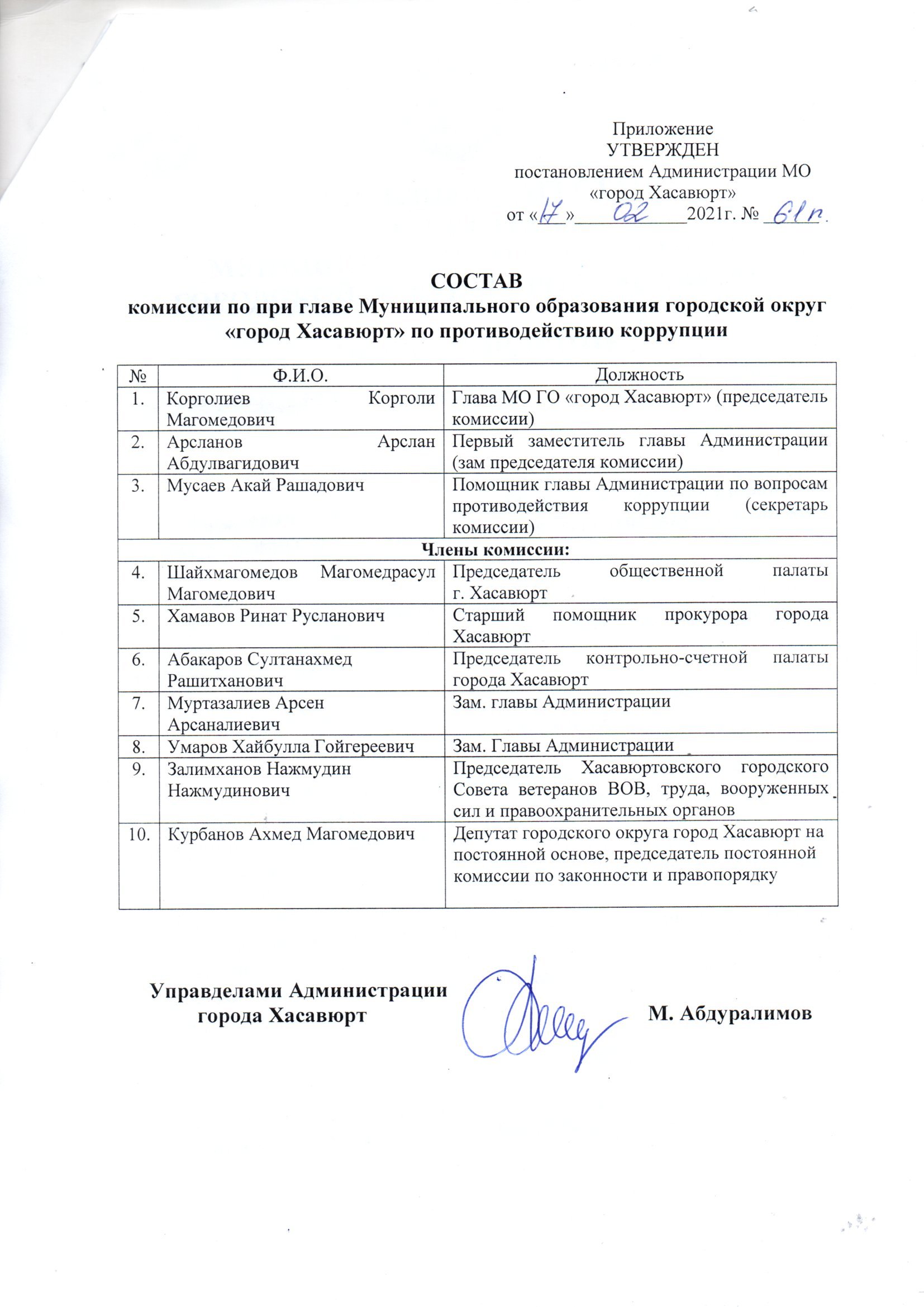 Постановление Об обновлении Комиссии при главе Муниципального образования городской округ «город Хасавюрт» по противодействию коррупции