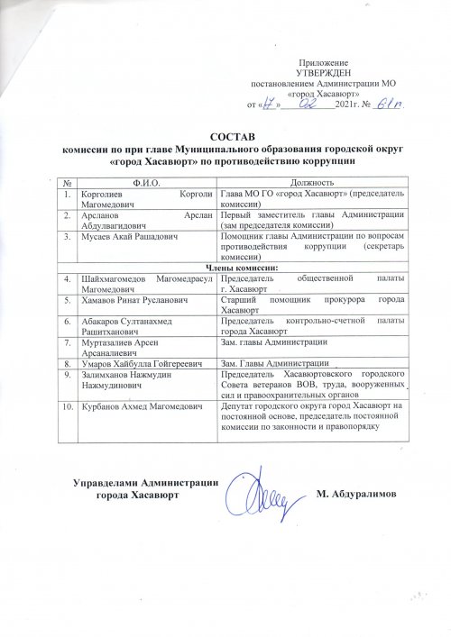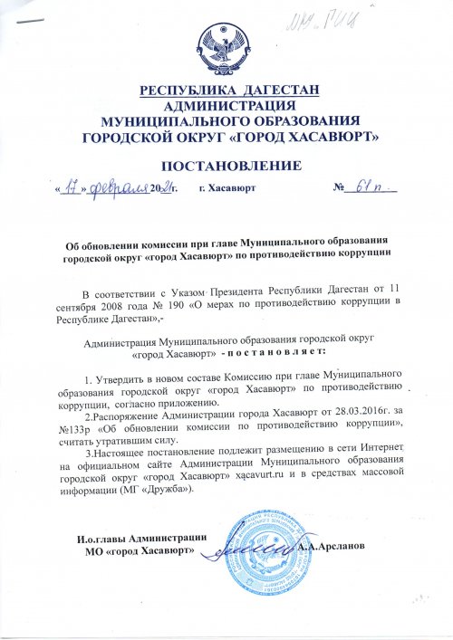 Постановление №61п от 17.02.2021г об обновлении комиссии при главе Муниципального образования городской округ «город Хасавюрт» по противодействию коррупции.