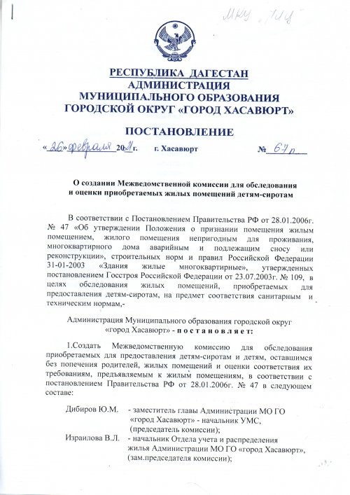 Постановление №67п от 26 февраля 2021 г. О создании Межведомственной комиссии для обследования и оценки приобретаемых жилых помещений детям-сиротам