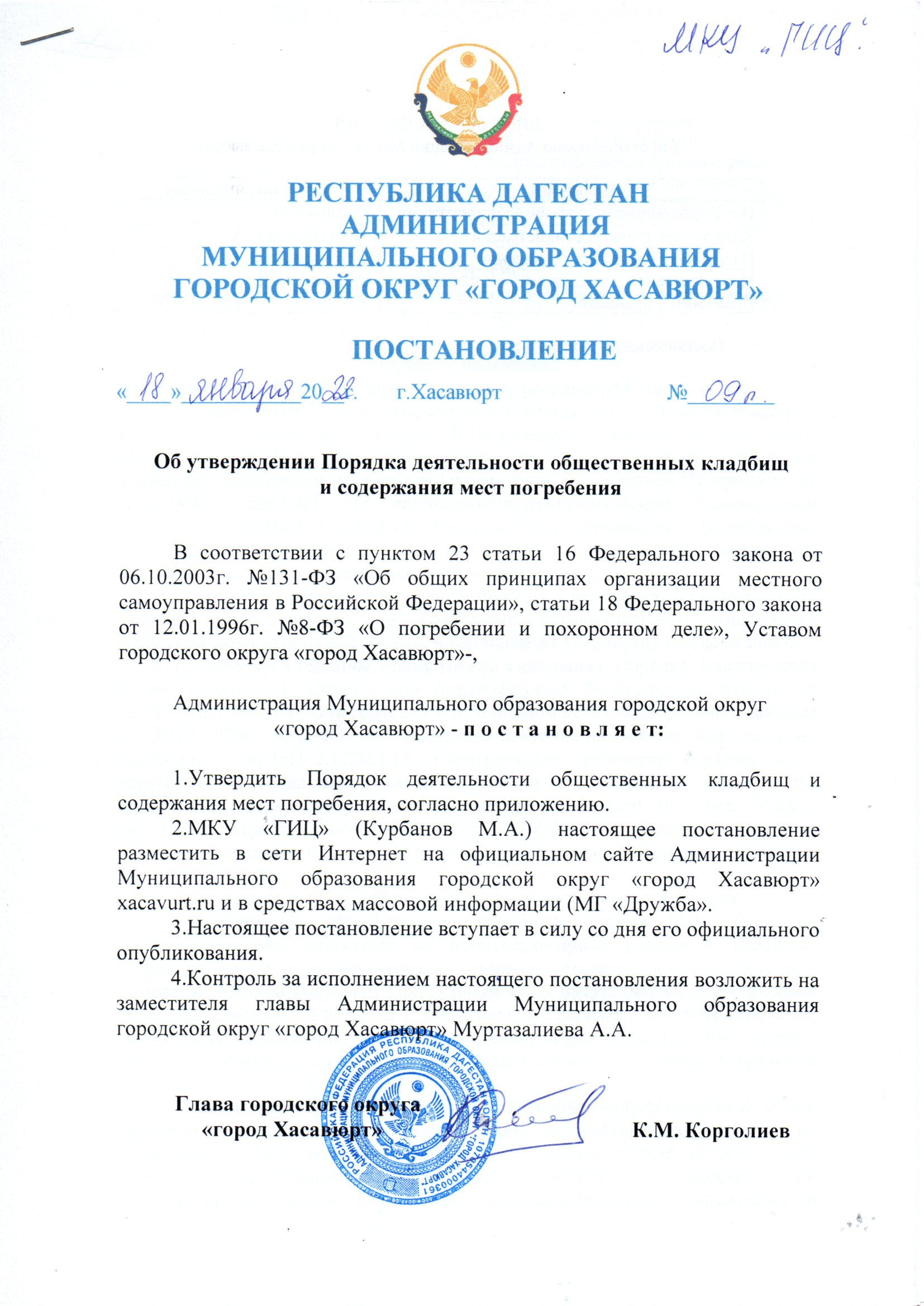 Постановление №09п от 18 января 2022г. об утверждении Порядка деятельности общественных кладбищ и содержания мест погребения