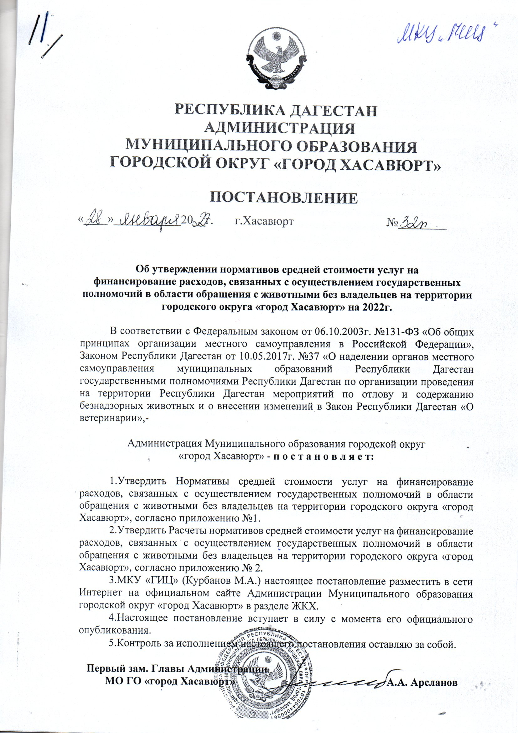 Постановление №32п от 28 января 2022г об утверждении нормативов средней стоимости услуг на финансирование расходов, связанных с осуществлением государственных полномочий в области обращения с животными без владельцев на территории городского округа "город Хасавюрт" на 2022 год
