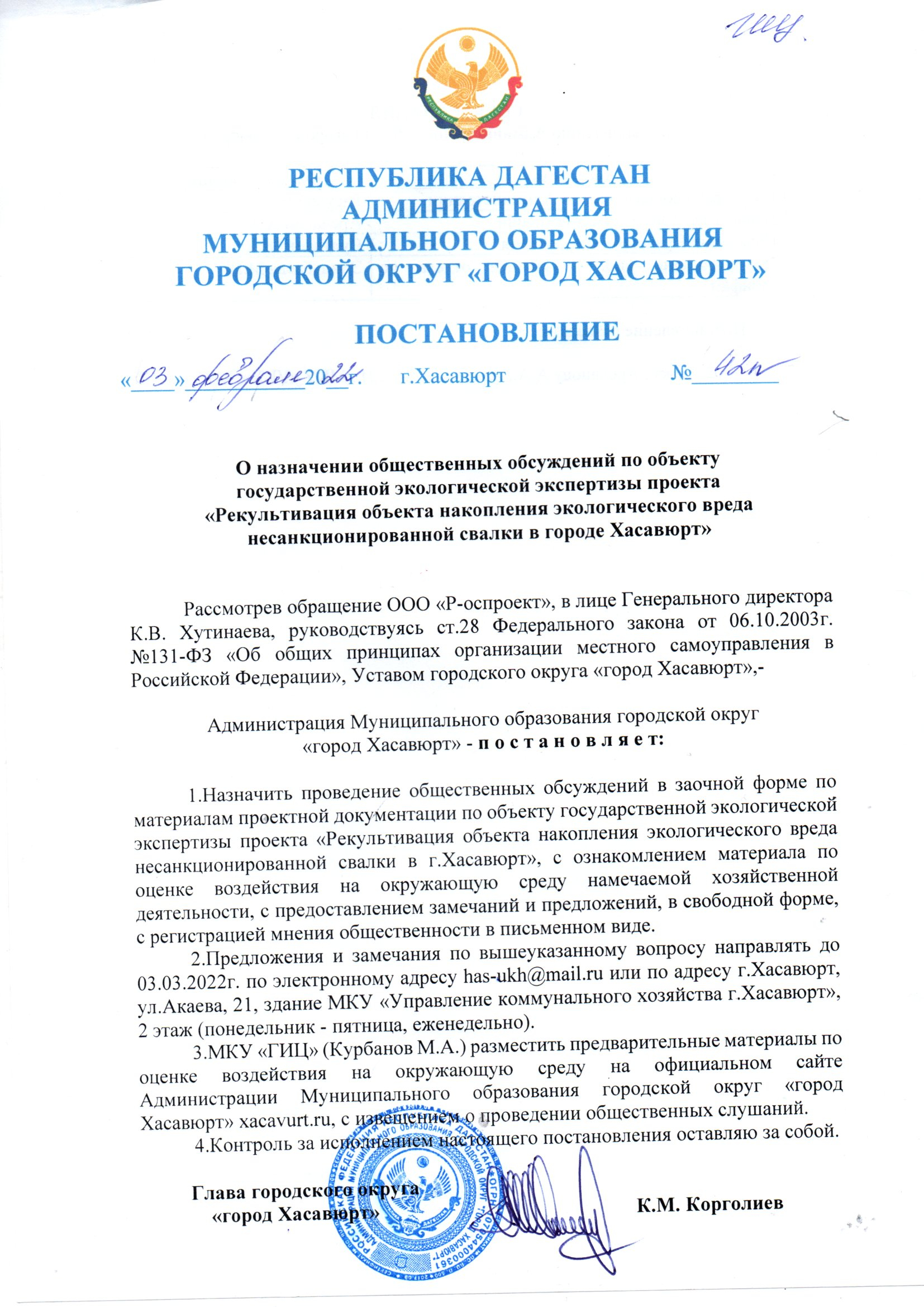 Постановление №42п от 3 февраля 2022 г. О назначении общественных обсуждений по объекту государственной экологической экспертизы проекта "Рекультивация объекта накопления экологического вреда несанкционированной свалки в городе Хасавюрт"