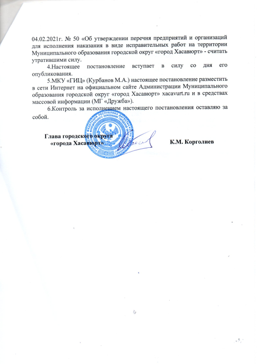 Постановление об утверждении перечня предприятий, организаций и учреждений для исполнения наказания в виде исправительных работ на территории Муниципального образования городской округ "город Хасавюрт"