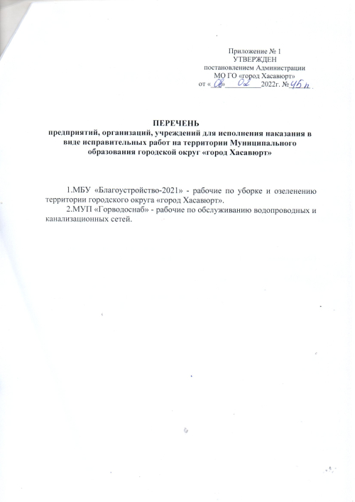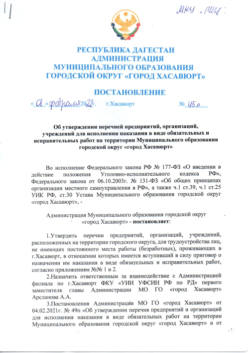 Постановление №45п от 8 февраля 2022г. Об утверждении перечней предприятий, организаций, учреждений для исполнения наказания в виде обязательных и исправительных работ на территории МО ГО "город Хасавюрт"