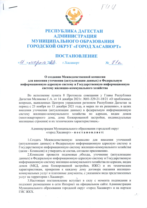 Постановление №71п от 1 марта 2022 г. О создании Межведомственной комиссии для внесения уточнения (актуализации данных) в Федеральную информационную адресную систему и Государственную информационную систему жилищно-коммунального хозяйства