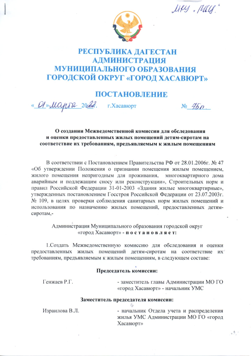 Постановление №75п от 1 марта 2022 г. О создании Межведомственной комиссии для обследования и оценки предоставленных жилых помещений детям-сиротам на соответствие их требованиям, предъявляемым к жилым помещениям