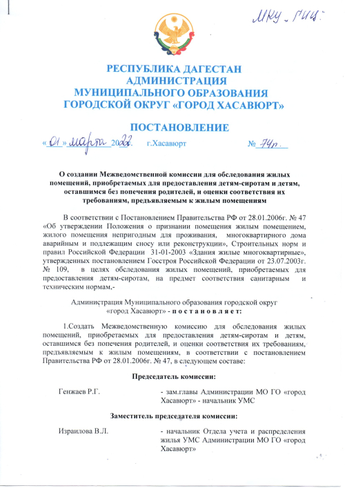 Постановление №74 п от 1 марта 2022 г. О создании Межведомственной комиссии для обследования жилых помещений, приобретаемых для предоставления детям-сиротам и детям, оставшимся без попечения родителей,