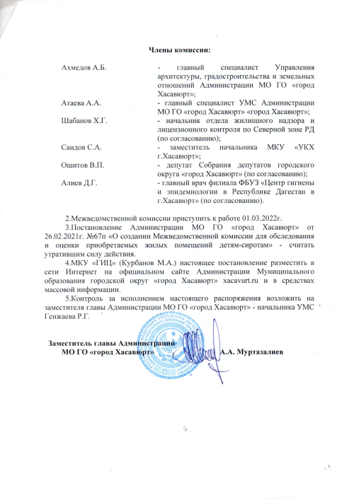 Постановление №67п от 26 февраля 2021 г. О создании Межведомственной комиссии для обследования и оценки приобретаемых жилых помещений детям-сиротам