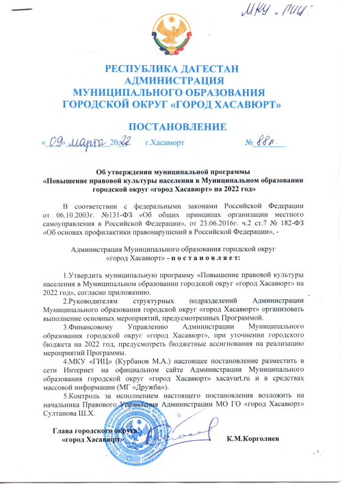 Постановление №88п 9 марта 2022 г. Об утверждении муниципальной программы "Повышение правовой культуры населения в Муниципальном образовании городской округ "город Хасавюрт"
