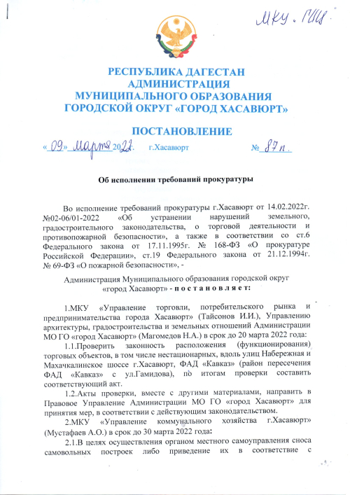Постановление №87 п от 9 марта 2022 г. Об исполнении требований прокуратуры