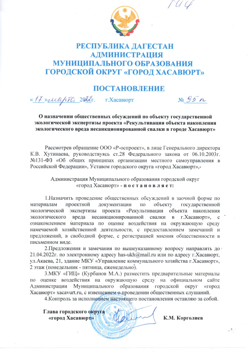 Постановление №95 от 17 марта 2022 г. О назначении общественных обсуждений по объекту государственной экологической экспертизы проекта "Рекультивация объекта накопления экологического вреда несанкционированной свалки в городе Хасавюрт"