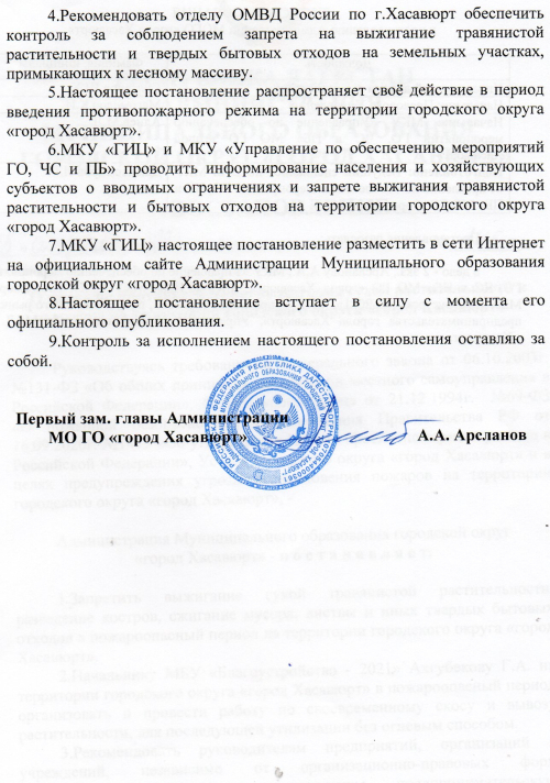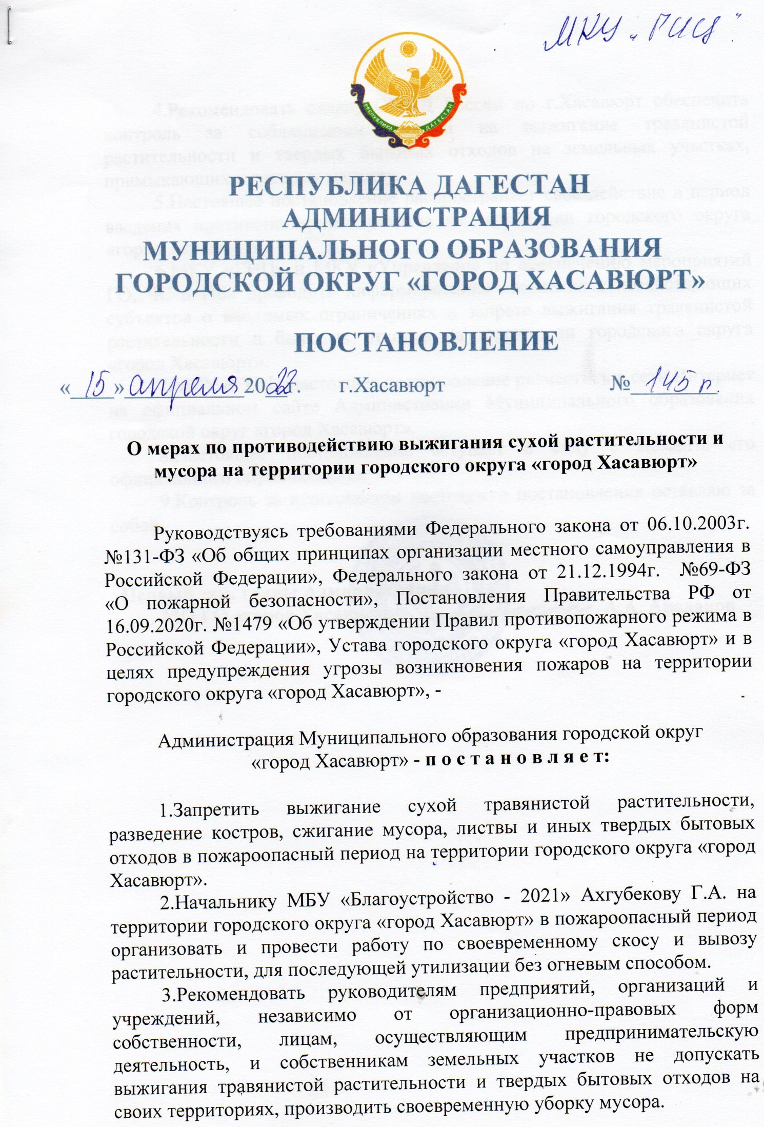 Постановление №145п от 15 апреля 2022 года о мерах по противодействию выжигания сухой растительности и мусора на территории городского округа "город Хасавюрт"