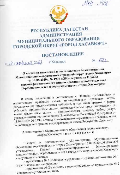 Постановление №148п от 19 апреля 2022г о внесении изменений в постановление Администрации Муниципального образования городской округ "город Хасавюрт" от 12.08.2020г. №199п "Об утверждении Правил персонифицированного финансирования дополнительного образования детей в городском округе "город Хасавюрт"
