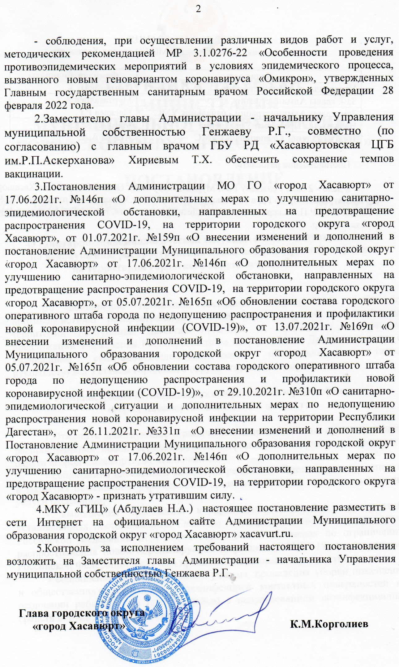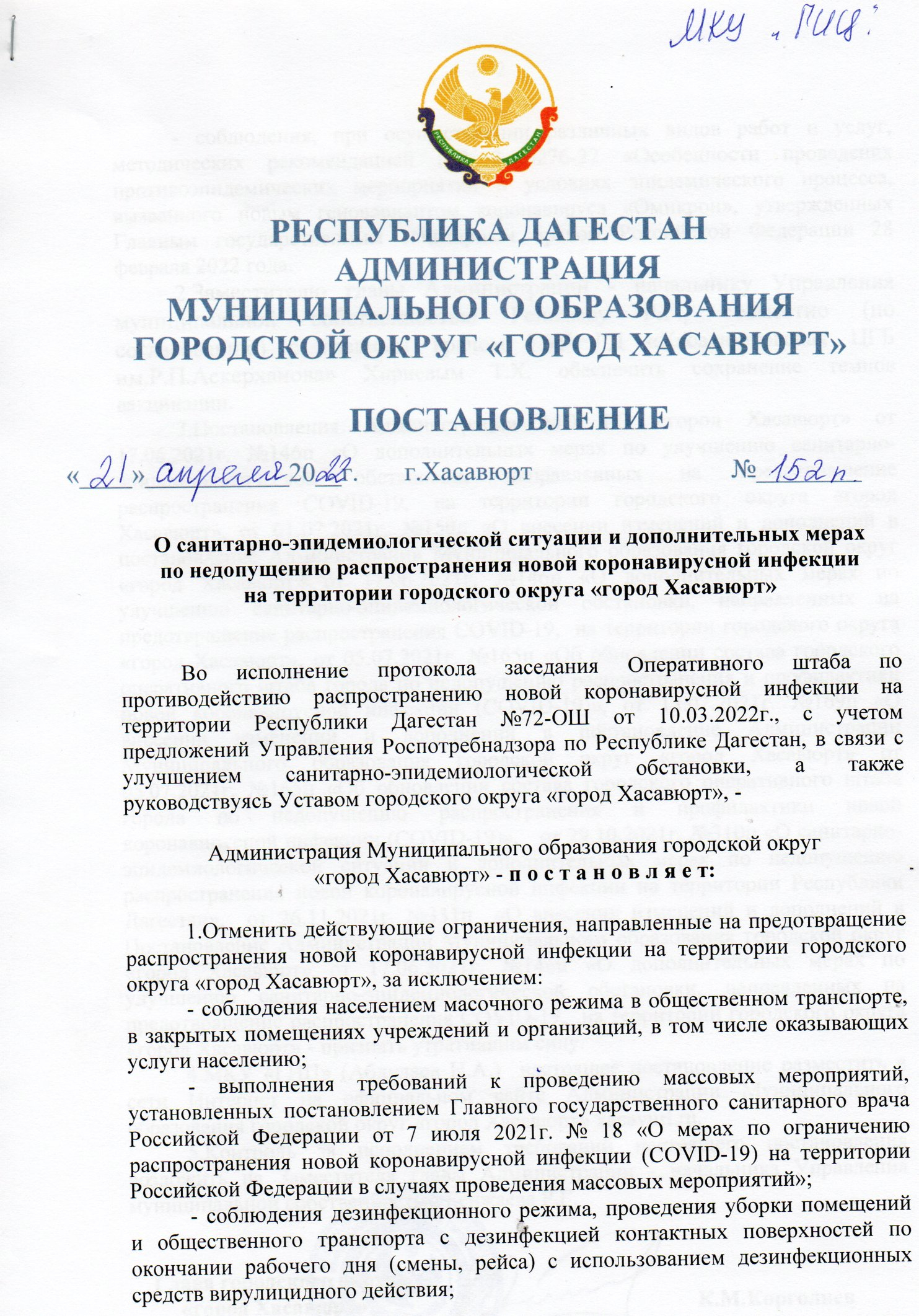 Постановление №152п от 21 апреля 2022г о санитарно-эпидемиологической и дополнительных мерах по недопущению распространения новой коронавирусной инфекции на территории городского округа "город Хасавюрт"