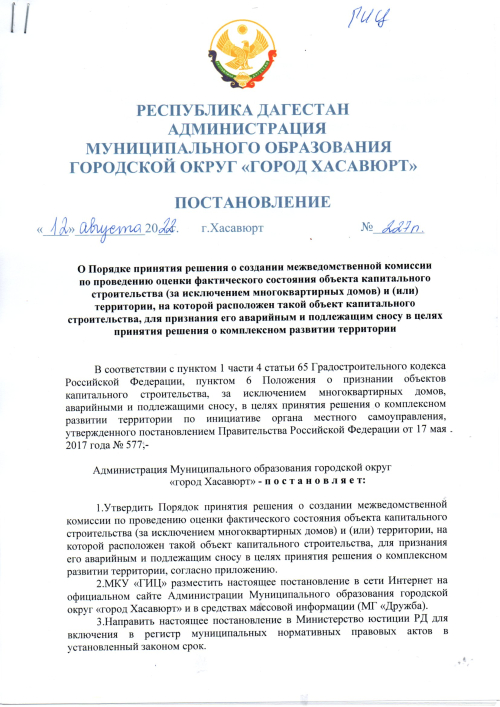 Постановление О создании межведомственной комиссии по обследованию земельных участков и объектов капитального строительства на территории Муниципального образования «город Хасавюрт»