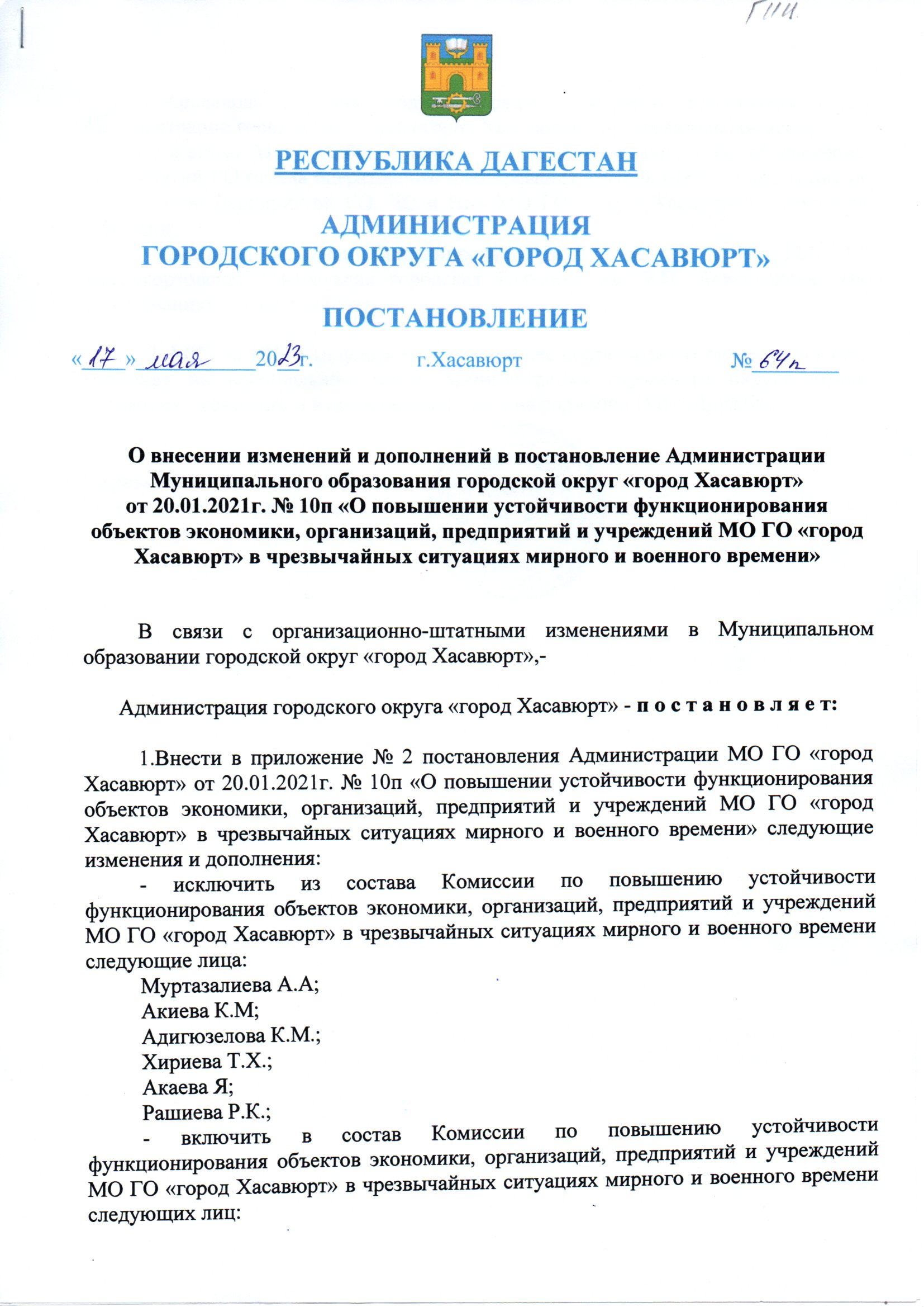 Постановление № 64п от 17 мая 2023 г. О внесении изменений и дополнений в постановление Администрации Муниципального образования городской округ "город Хасавюрт" от 20.01.2021 г. № 10п "О повышении устойчивости функционирования объектов экономики, организаций, предприятий и учреждений МО ГО "город Хасавюрт" в чрезвычайных ситуациях мирного и военного времени"