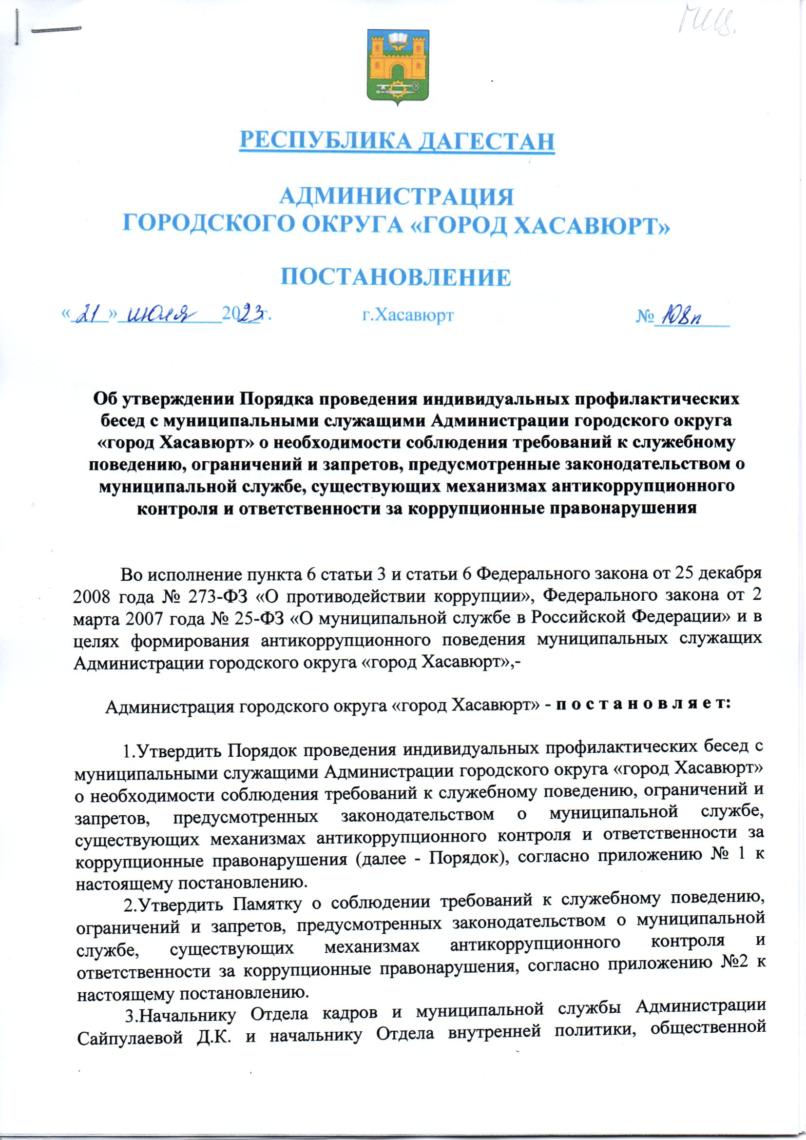 Постановление № 108п от 21 июля 2023 г. Об утверждении Порядка проведения индивидуальных профилактических бесед с муниципальными служащими Администрации городского округа "город Хасавюрт"
