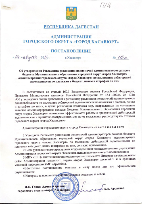 Постановление № 110п от 04 августа 2023 г. Об утверждении Регламента реализации полномочий администраторов доходов бюджета Муниципального образования городской округ «город Хасавюрт» Администрации городского округа «город Хасавюрт»