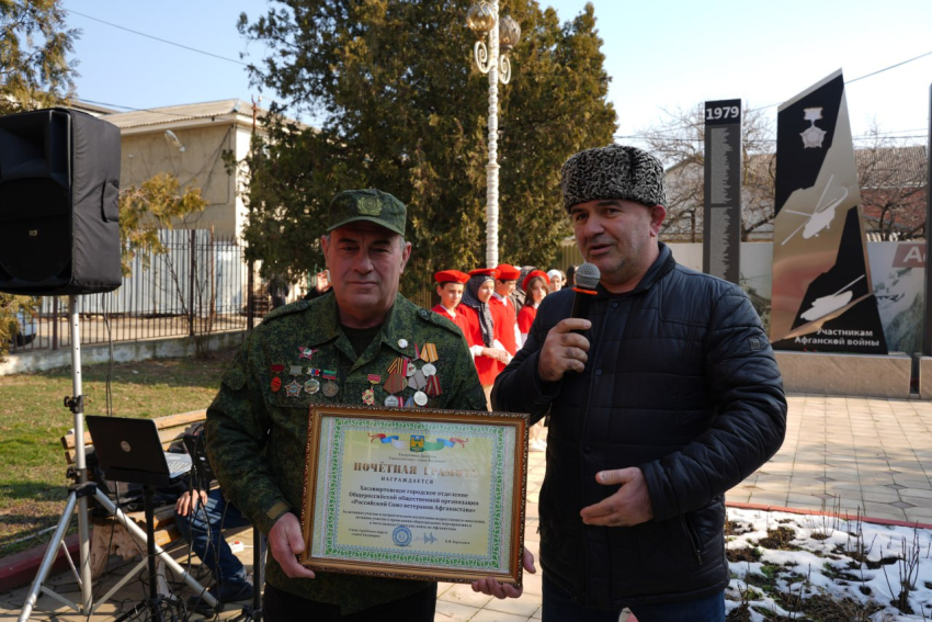 «Дорогие товарищи, разрешите поздравить вас от имени Главы города Корголи Корголиева с этим памятным днем, выразить искреннюю благодарность всем ветеранам, которые с честью и мужеством исполняли свой долг. Ваши подвиги и самоотверженность служат примером для будущих поколений. Мы не должны забывать о тех, кто отдал свою жизнь за нашу свободу и мирное небо над головой», - сказал Умаров, затем вручил Почетную Грамоту Хасавюртовскому городскому отделению Российского союза ветеранов Афганистана.