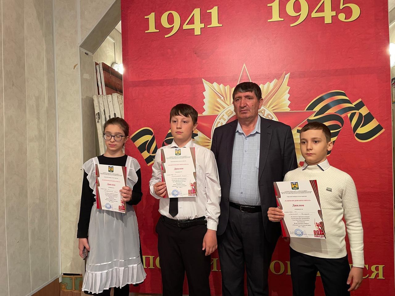 Победители городского конкурса были награждены дипломами и денежными призами. Глава Хасавюрта Корголи Корголиев отмечает важность подобных мероприятий для развития творческих навыков у юных хасавюртовцев, а также для формирования у них чувства патриотизма и гордости за защитников Отечества.