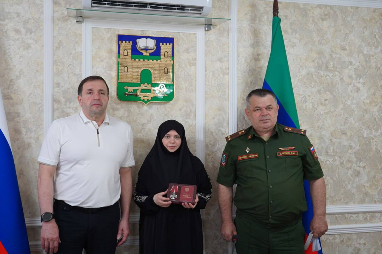 В конференц-зале Администрации Хасавюрта, Глава города Корголи Корголиев, совместно со своим заместителем Хайбуллой Умаровым и военным комиссаром по городу Хасавюрту, Хасавюртовскому и Новолакскому районам Абакаром Давудовым, передал орден Мужества дочери военнослужащего, погибшего на СВО, Руслана Магомедова.