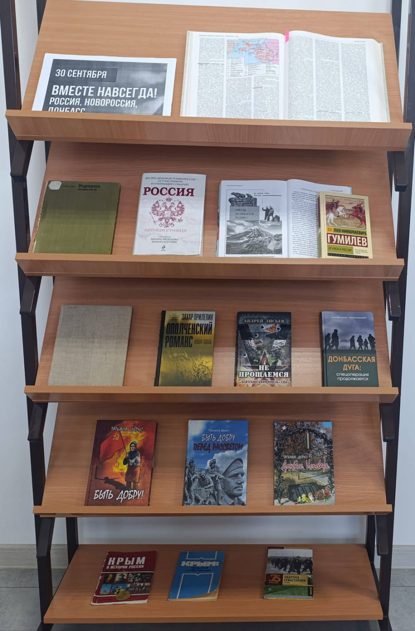 В библиотеке Хасавюрта открылась книжная выставка «Вместе навсегда», приуроченная ко Дню воссоединения Донбасса и Новороссии с Россией.