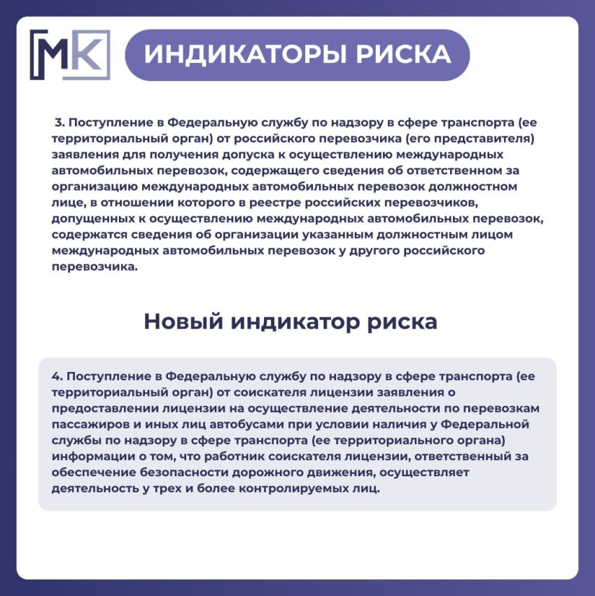 Приказом Министерства транспорта Российской Федерации от 28.11.2025 г. № 417 «О внесении изменений в перечень индикаторов риска нарушения обязательных требований при осуществлении федерального государственного контроля (надзора) на автомобильном транспорте, городском наземном электрическом транспорте и в дорожном хозяйстве, утвержденный приказом Министерства транспорта Российской Федерации от 22 июня 2023 г. № 229» вводится новый индикатор риска при осуществлении федерального государственного контроля (надзора) на автомобильном транспорте, городском наземном электрическом транспорте и в дорожном хозяйстве.