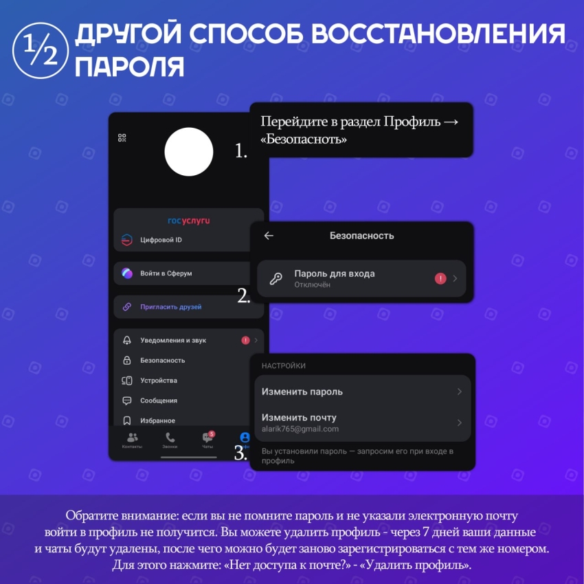 Что делать, если вы забыли пароль в мессенджере MAX? 31 марта 2026, Вторник Категории Новости / Информация Если вы не можете войти в аккаунт из-за забытого пароля - не переживайте, доступ можно восстановить. Важно действовать последовательно.О том, как это сделать - читайте в карточках. Читайте также: 30 марта 2026, Понедельник Как включить двухфакторную аутентификацию (2FA) в мессенджере MAX 19 августа 2024, Понедельник Штраф за вождение без прав в 2024 году 16 декабря 2025, Вторник МФЦ Республики Дагестан теперь в мессенджере «MAX» 28 января 2026, Среда С карты пропали деньги? Инструкция для безопасности и возврата 26 сентября 2016, Понедельник В МФЦ г. Хасавюрт помогут узнать о размере своей пенсии