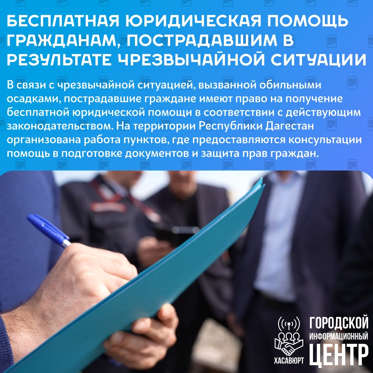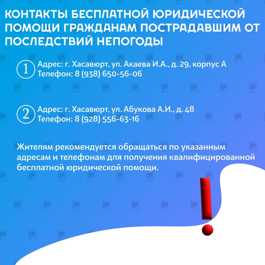 В соответствии с частью 1 пункта 8 статьи 20 и частью 2 пункта 16 статьи 20 Федерального закона от 21 ноября 2011 года № 324-ФЗ «О бесплатной юридической помощи в Российской Федерации», а также частью 3 пункта 6 статьи 9 Закона Республики Дагестан от 14 июня 2012 года № 32 «О бесплатной юридической помощи в Республике Дагестан», граждане, пострадавшие в результате чрезвычайных ситуаций, имеют право на получение бесплатной юридической помощи для защиты своих прав, восстановления имущественных и личных неимущественных прав, а также содействия в возмещении причинённого ущерба.