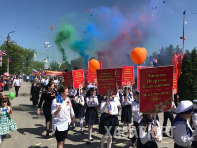 После чего в строгом порядке один за другим перед трибунами торжественным маршем прошли колонны демонстрантов. В 2018 году на параде промаршировали 25 колонн. Как отмечают организаторы, более 20 тысяч горожан приняли участие в демонстрации. Еще одна колонна встречала ветеранов и гостей торжеств возле братского кладбища и у памятника при вьехде в город «Танк Т-72» сооруженному властями города в подарок Герою Советского Союза Эльмурзе Джумагулову.