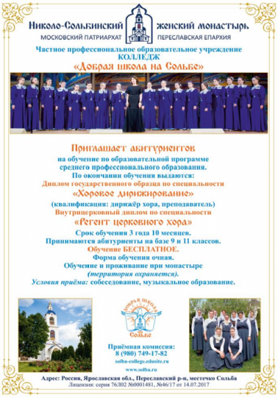 В Ярославской области открыт колледж при Николо-Сольбинском монастыре "Добрая школа на Сольбе".